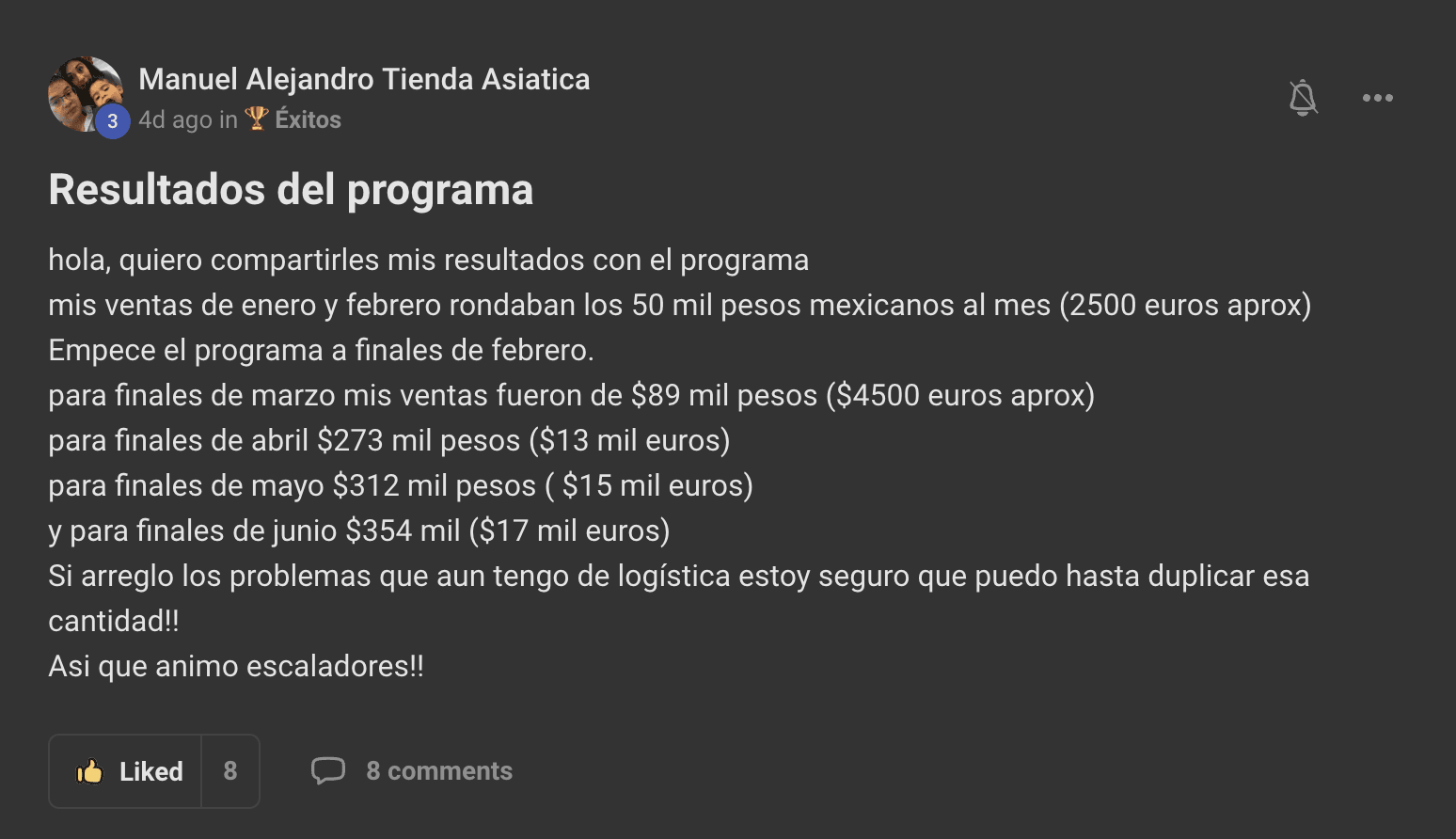 Su Resultado: Tras 9 meses con nosotros, han pasado de tener un gasto de -450€ mensuales a ganar un sueldo limpio de +2500€ mensuales. Incluso han preparado la estructura logística para escalar este final de 2023 a +20.000€ de facturación mensual con +30% margen de beneficio, aproximadamente unos 6.000€/mes limpios.