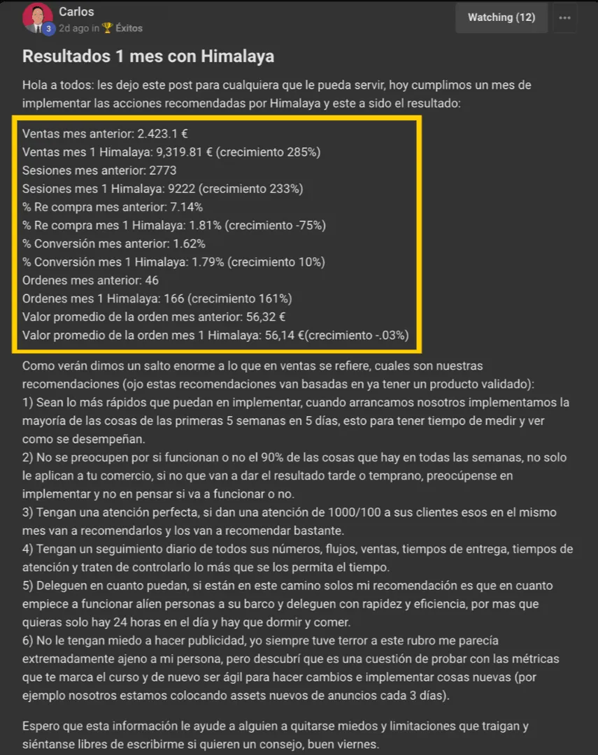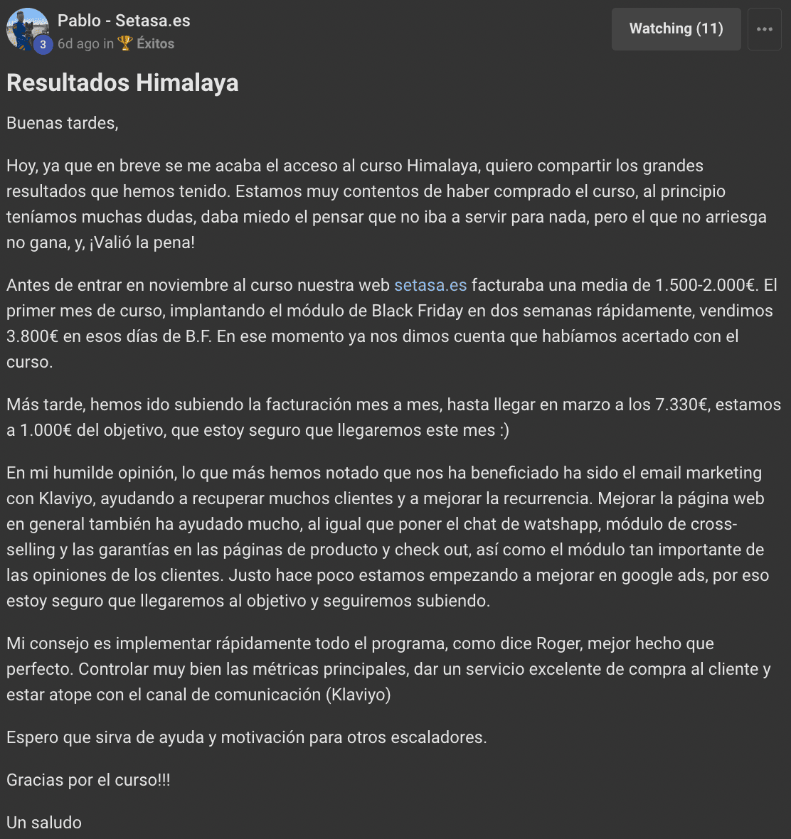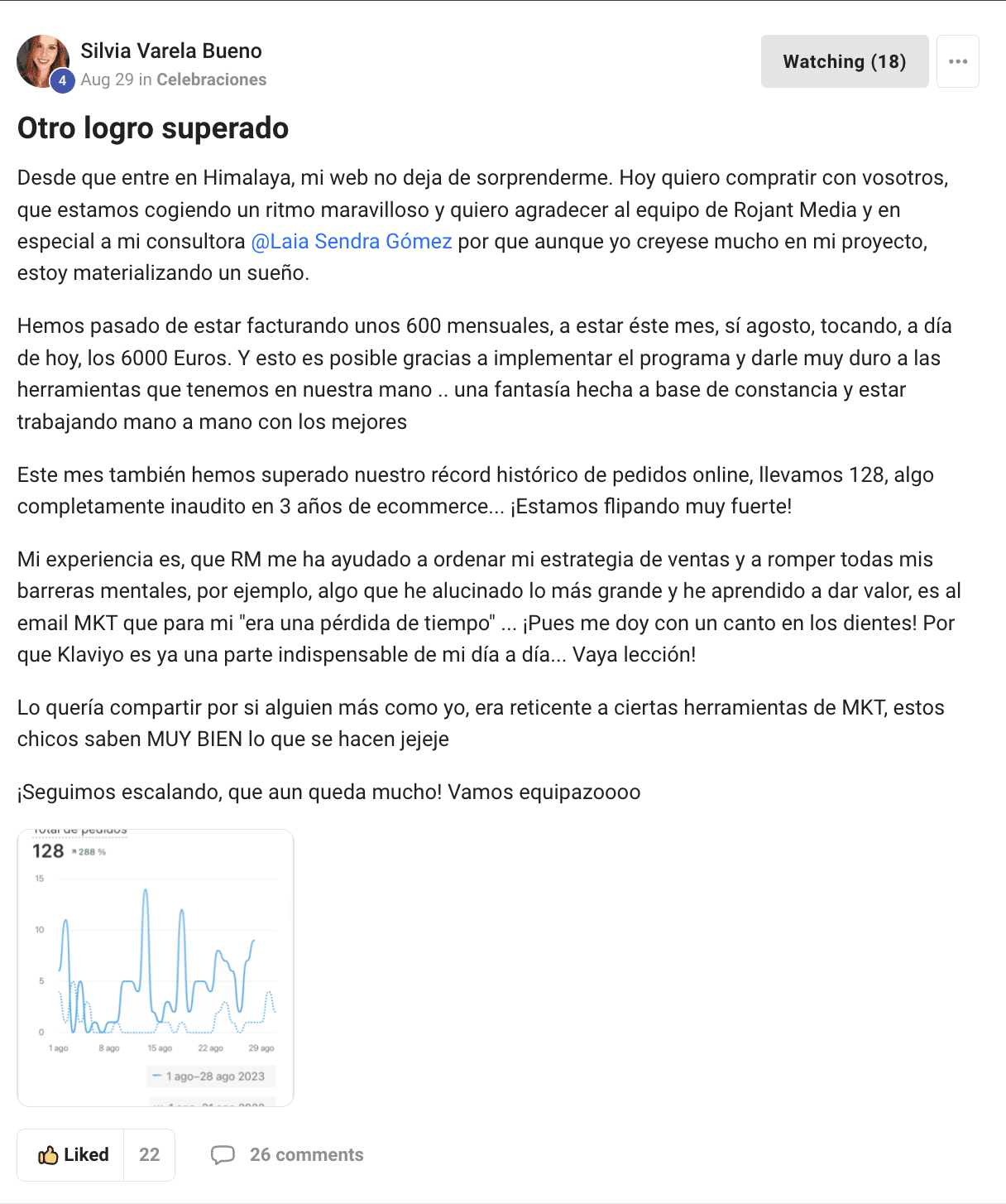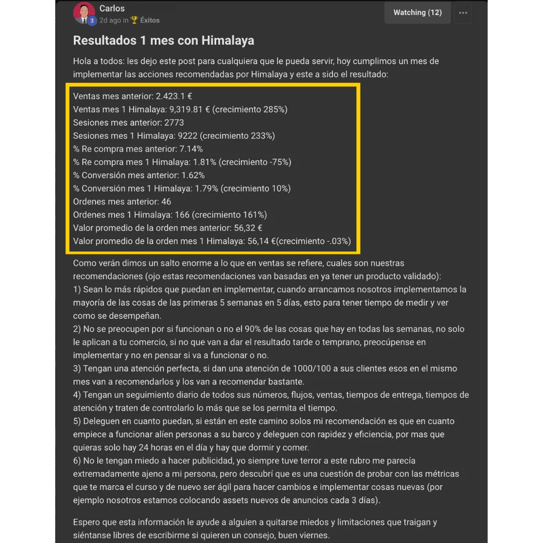 20 días después de empezar con nosotros, su web ya era una máquina rentable que generaba ventas y empezamos a escalar hasta los 10.000€ al mes orgánicamente, por redes sociales y otros canales directos, consiguiendo ventas gratuitas y por tráfico de pago con nuestra estrategia Himalaya de manera muy muy rentable (23% margen de beneficio).