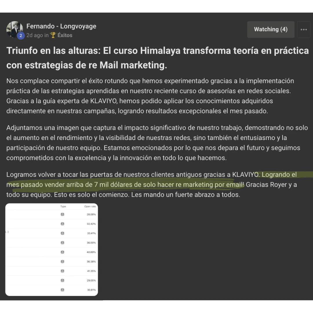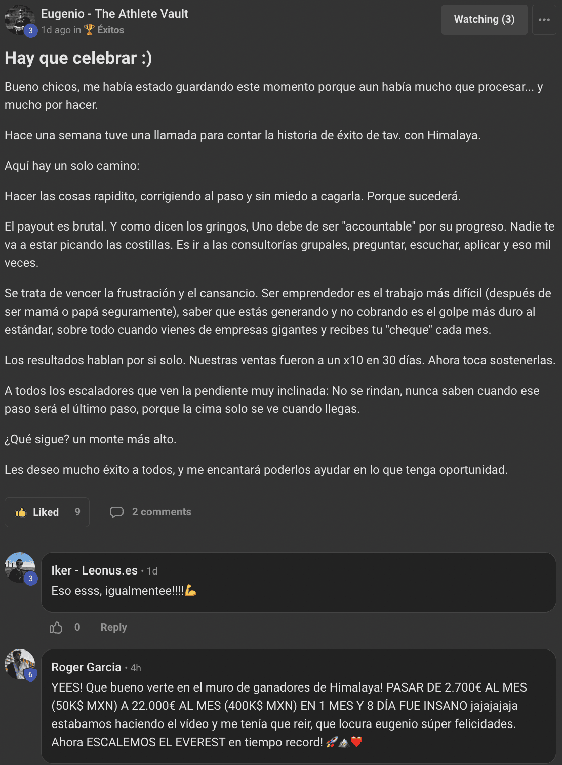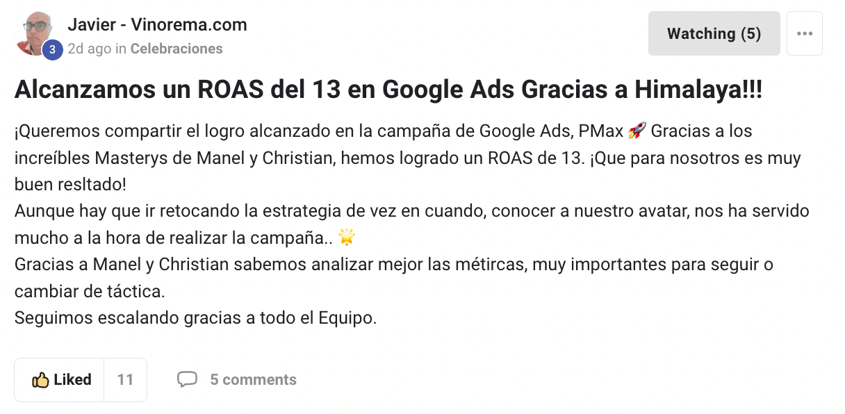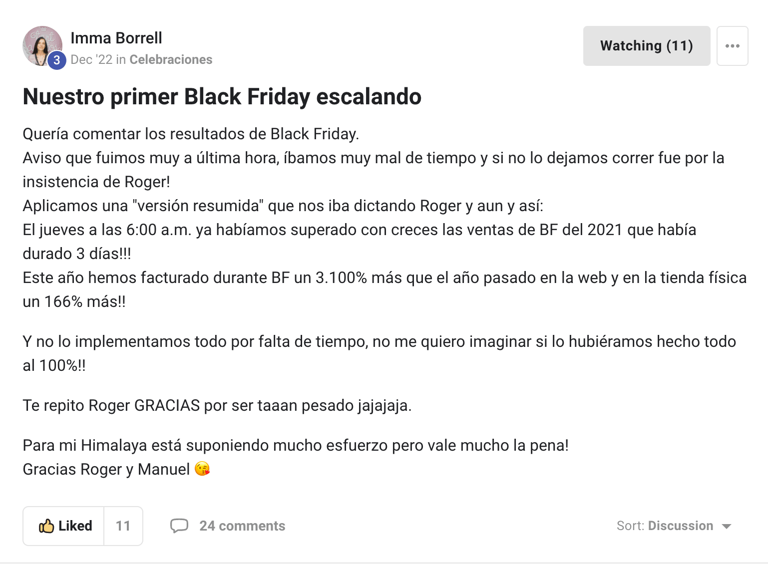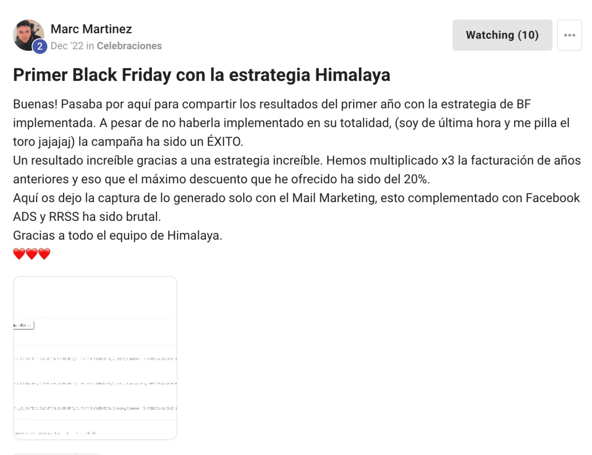 20 días después de empezar con nosotros, su web ya era una máquina rentable que generaba ventas y empezamos a escalar hasta los 10.000€ al mes orgánicamente, por redes sociales y otros canales directos, consiguiendo ventas gratuitas y por tráfico de pago con nuestra estrategia Himalaya de manera muy muy rentable (23% margen de beneficio).