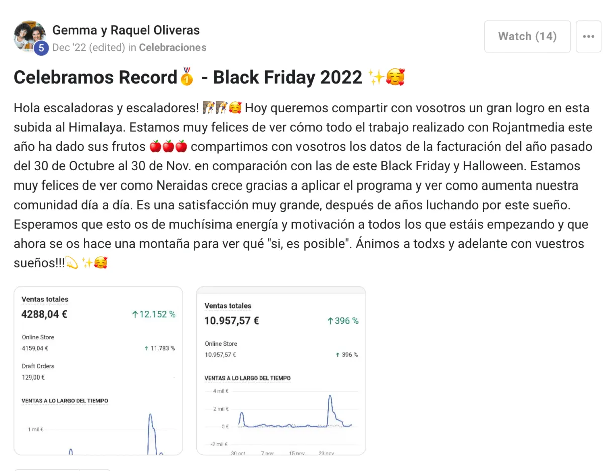 Hemos ayudado a Gema y Raquel a llevar "neraidas.com" de facturar 200€/mes a Ganar +2500€ de Beneficio Neto Mensual en solo 9 meses, optimizando su oferta y creando fuentes de tráfico orgánicas y de pago con nuestra estrategia.